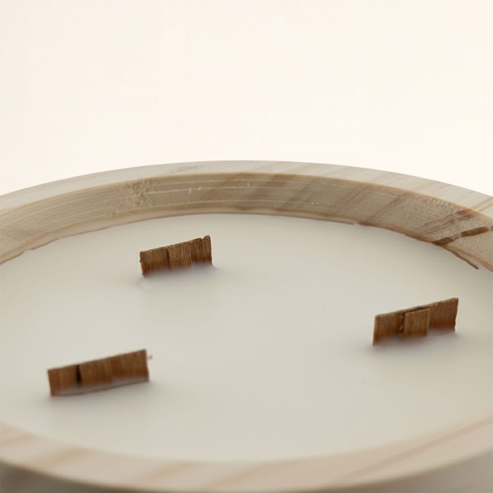 La Vela con mechas de madera Mantel Puesto en la Mesa es redonda y de madera. Sus 3 mechas son crepitantes, así que la luz que emiten es una pasada: cálida, uniforme y muy acogedora.